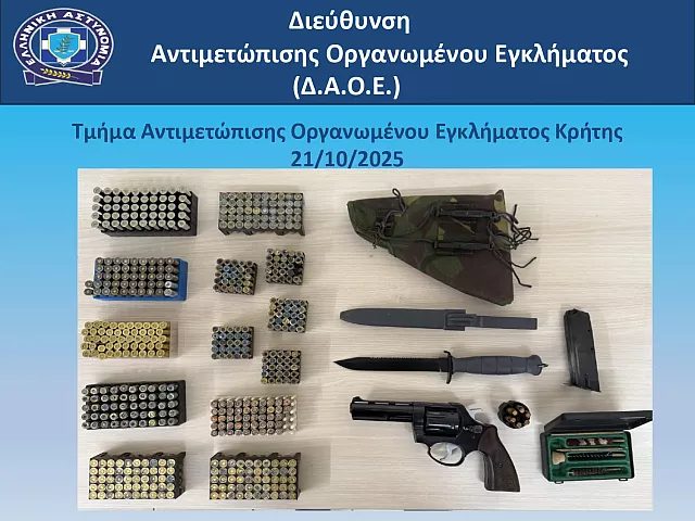 Από το Τμήμα Αντιμετώπισης Οργανωμένου Εγκλήματος Κρήτης της Διεύθυνσης Αντιμετώπισης Οργανωμένου Εγκλήματος συνελήφθη πρωινές ώρες σήμερα, Τρίτη 21 Οκτωβρίου 2025, σε περιοχή του Ηρακλείου Κρήτης, 57χρονος, κατηγορούμενος για παράβαση της νομοθεσίας για τα όπλα και τις ηλεκτρονικές επικοινωνίες.