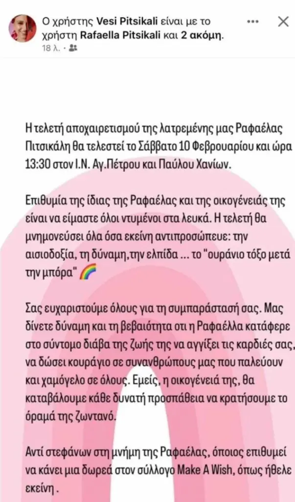 Η μητέρα της Ραφαέλας που προ ημερών γνωστοποίησε την ημερομηνία της κηδείας, τόνισε την επιθυμία της 21χρονης αλλά και της ίδιας της οικογένειας, οι παρευρισκόμενοι να είναι ντυμένοι στα λευκά.