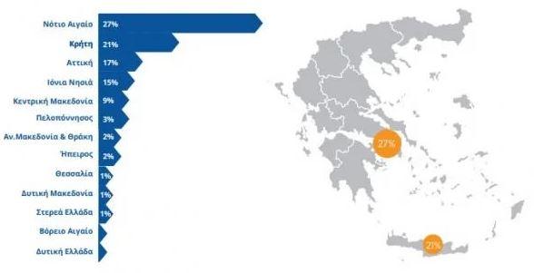 Το Νότιο Αιγαίο με μερίδιο 27% επί των εισπράξεων, η Κρήτη με 21%, η Αττική με 17%, τα Ιόνια νησιά με 15% και η Κεντρική Μακεδονία με 9% συγκεντρώνουν σχεδόν το 90% των εισπράξεων.