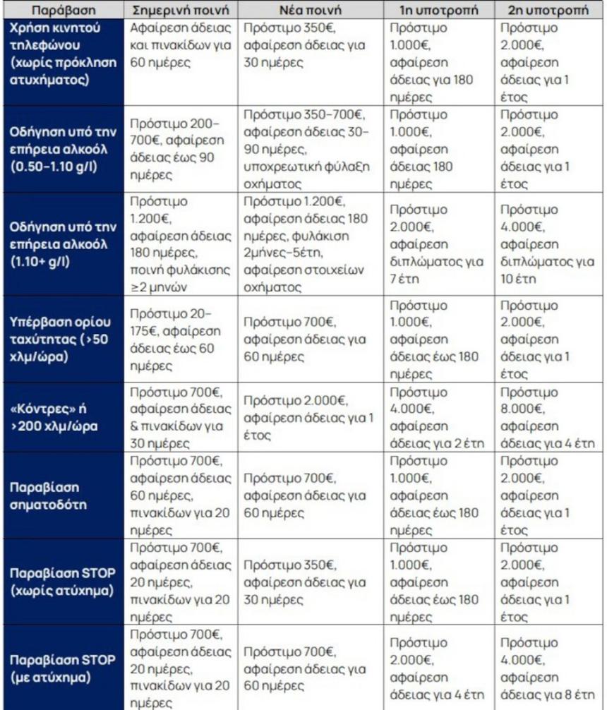 Ενδεικτικό παράδειγμα αυτής της νέας δομής ποινών αποτελεί η αντιμετώπιση της χρήσης κινητού τηλεφώνου, που το 2024 ήταν η τρίτη αιτία πρόκλησης τροχαίων στην Ελλάδα. Σήμερα, ανεξαρτήτως της πρόκλησης ατυχήματος, η χρήση κινητού επισύρει αφαίρεση άδειας οδήγησης και πινακίδων για 60 ημέρες.