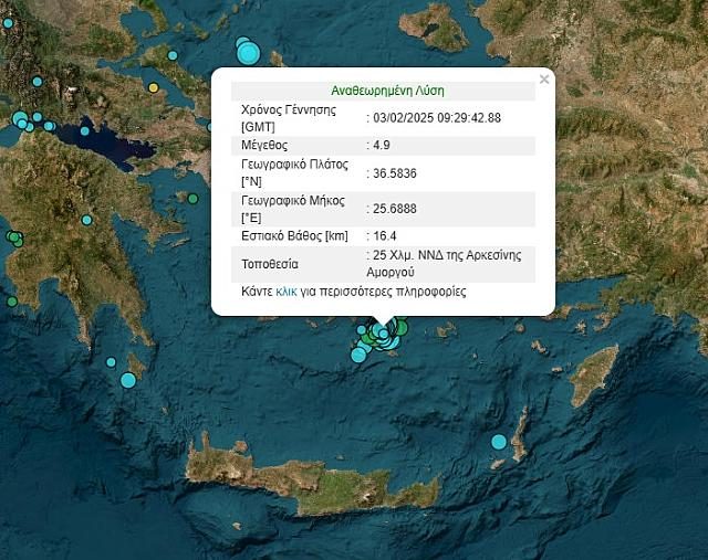 Μάλιστα η δόνηση έγινε αισθητή και στο Ηράκλειο. Σύμφωνα με την αναθεωρημένη λύση του Γεωδυναμικού Ινστιτούτου Αθηνών, ο σεισμός είχε εστιακό βάθος 16,4 χιλιόμετρα, ενώ το επίκεντρο εντοπίζεται 25 χλμ ΝΝΔ της Αρκεσίνης Αμοργού.