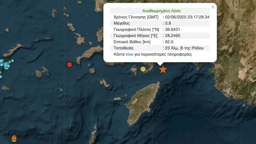 Σημειώνεται πως η ισχυρή σεισμική δόνηση μεγέθους 5,8 βαθμών της κλίμακας Ρίχτερ σημειώθηκε στις 02:17 τα ξημερώματα της Τρίτης στα ανοιχτά της Ρόδου.