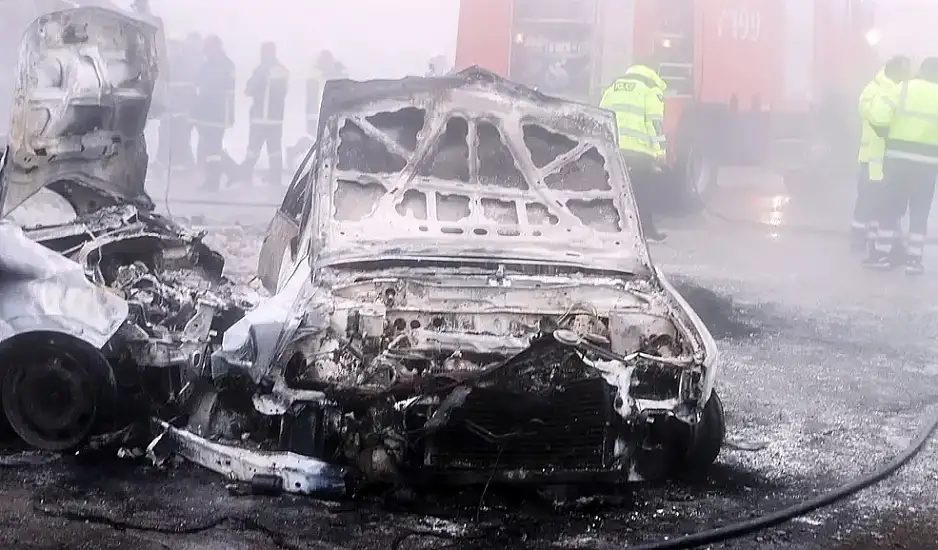 Μέσα σε ομίχλη, φορτηγό έπεσε πάνω σε δύο ΙΧ. Όλα τα οχήματα τυλίχθηκαν στις φλόγες.
