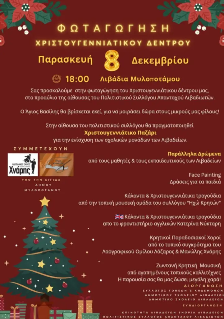Σας προσκαλούμε, στις 8 Δεκεμβρίου, στις 6 το απόγευμα, στη φωταγώγηση του Χριστουγεννιάτικου δέντρου μας, στα Λιβάδια!
