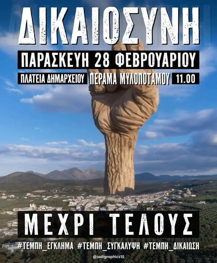 Η τραγωδία των Τεμπών, που συγκλόνισε την ελληνική κοινωνία, συνεχίζει να αποτελεί σημείο αναφοράς για τη διεκδίκηση δικαιοσύνης. Στις 28 Φεβρουαρίου, στην Πλατεία Δημαρχείου στο Πέραμα Μυλοποτάμου, διοργανώνεται συγκέντρωση διαμαρτυρίας με κεντρικό σύνθημα «Δικαιοσύνη – Μέχρι Τέλους». Η εκδήλωση αυτή έρχεται ως κραυγή αγανάκτησης απέναντι στην ατιμωρησία και τη συγκάλυψη, απαιτώντας απόδοση ευθυνών για το πολύνεκρο δυστύχημα. Οι πολίτες, απαιτούν να μη ξεχαστεί η τραγωδία και να υπάρξει ουσιαστική δικαιοσύνη για τα θύματα και τις οικογένειές τους.