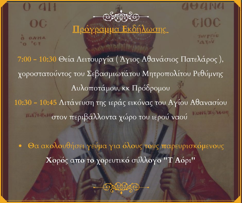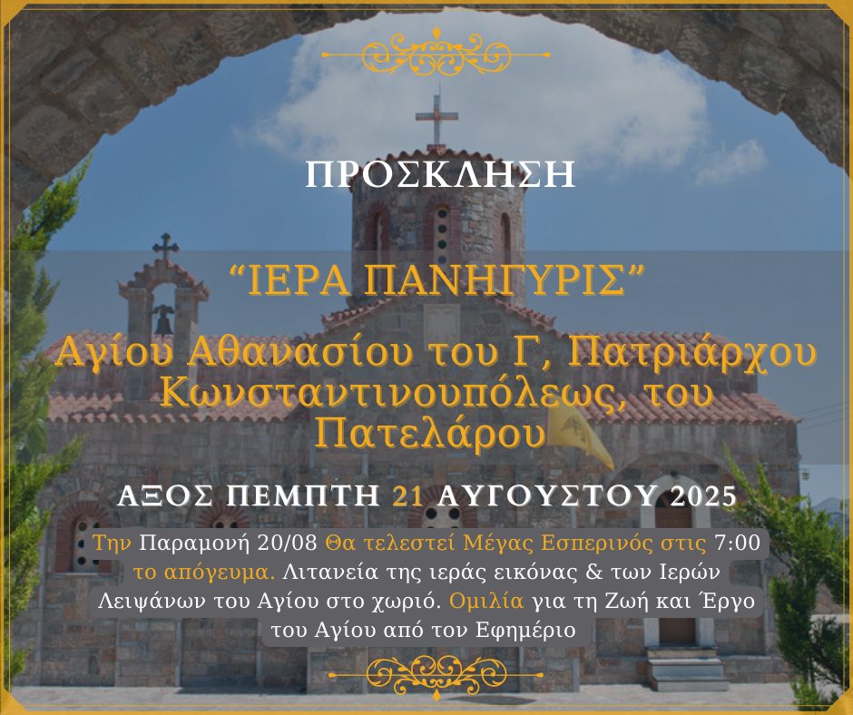 Με ιδιαίτερη χαρά και τιμή,η Ενορία, η Δημοτική Κοινότητα και ο Πολιτιστικός Σύλλογος Αξού – Λιβάδας σας προσκαλούν στην Ιερά Πανήγυρη του τοπικού Αγίου Αθανασίου Γ’ Πατριάρχου Κωνσταντινουπόλεως (Πατελάρου του Αξικού),που θα πραγματοποιηθεί στις 20 & 21 Αυγούστου 2025, στην Αξό Μυλοποτάμου.