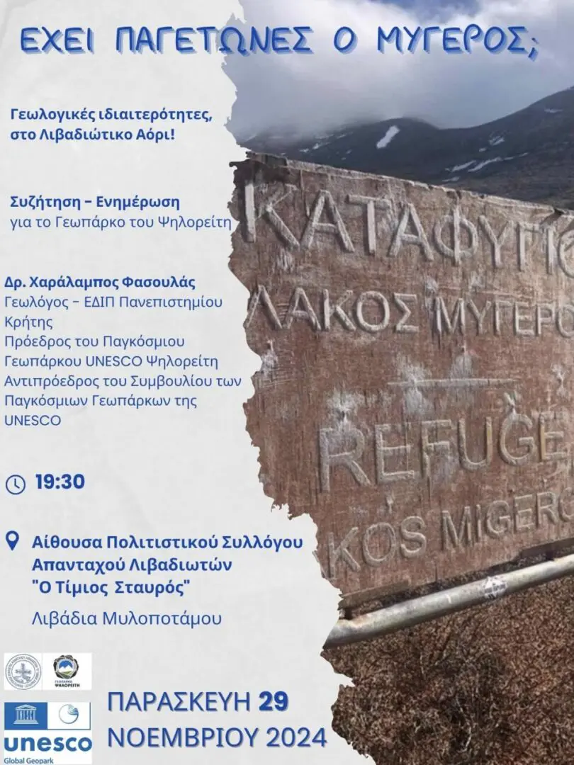 Αυτά και άλλα πολλά θα ανακαλύψουμε, θα ρωτήσουμε και θα συζητήσουμε, την Παρασκευή 29 Νοεμβρίου 2024, οπού ο Πολιτιστικός Σύλλογος Απανταχού Λιβαδιωτών «Ο Τίμιος Σταυρός» θα υποδεχθεί το Παγκόσμιο Γεωπάρκο UNESCO Ψηλορείτη, σε μια ανοιχτή συνάντηση, για όλες τις ηλικίες με σκοπό τη γνωριμία με τις γεωλογικές ιδιαιτερότητες της περιοχής μας και το Γεωπάρκο.