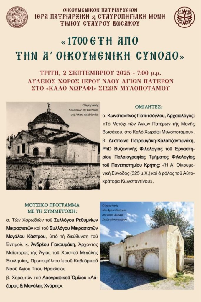 Με μεγάλη συγκίνηση, παρουσία του Σεβασμιωτάτου Μητροπολίτου Ρεθύμνης και Αυλοποτάμου κ.κ. Προδρόμου, πλήθους επισκεπτών κι επίτιμων προσκεκλημένων πραγματοποιήθηκε την Τρίτη, 2 Σεπτεμβρίου 2025, στον προαύλιο χώρο του Ιερού Μετοχίου της Ιεράς Πατριαρχικής και Σταυροπηγιακής Μονής Τιμίου Σταυρού Βωσάκου, στον Ιερό Ναό των Αγίων 318 Θεοφόρων Πατέρων της Α’ Οικουμενικής Συνόδου, στη θέση «Καλό Χωράφι» Σισών, η εκδήλωση μνήμης και τιμής, για τη συμπλήρωση 1700 ετών, από την εν Νικαία Α΄ Οικουμενική Σύνοδο.