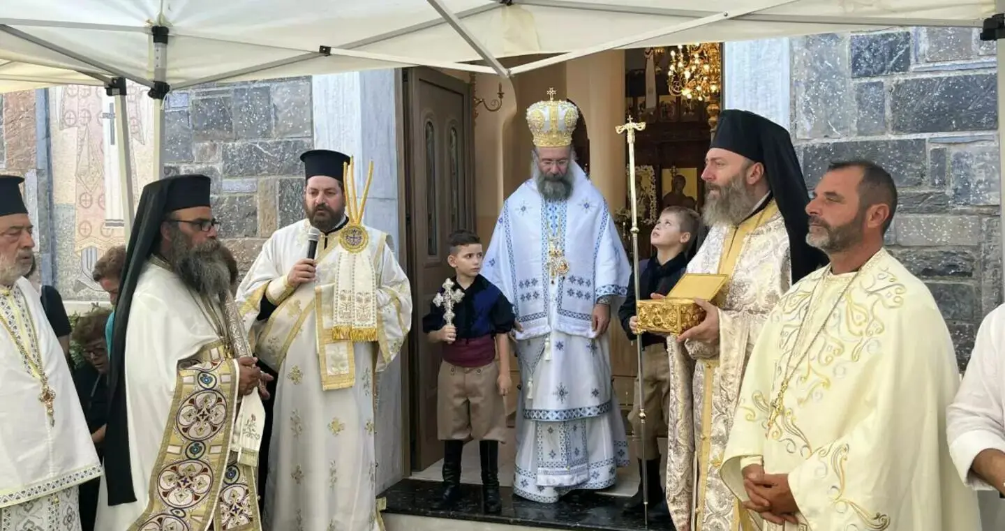 Προ της απολύσεως της Θείας Λειτουργίας, ο Σεβασμιώτατος εξέφρασε τη χαρά του για τη συμμετοχή όλων μας στην ετήσια Πανήγυρι, για μία ακόμη χρονιά, χαιρέτισε και συνεχάρη τον Εφημέριο της Ενορίας, Αιδεσιμολ. Πρωτοπρεσβύτερο Δαυΐδ Μιγαδάκη, και το Εκκλησιαστικό Συμβούλιο, τον Δήμαρχο Μυλοποτάμου κ. Γεώργιο Κλάδο και Αντιδημάρχους του Δήμου, τον Θεματικό Αντιπεριφερειάρχη της Περιφέρειας Κρήτης στον τομέα Επιχειρηματικότητας κ. Μιχάλη Βάμβουκα, τον Εντεταλμένο Περιφερειακό Σύμβουλο στον τομέα Πολιτικής Προστασίας και Πρόεδρο του Κέντρου Πρόληψης Περιφερειακής Ενότητος Ρεθύμνης κ. Μιχάλη Σαρρή, τον Λιμενάρχη Ηρακλείου, Αντιπλοίαρχο κ. Νικόλαο Τσομπάνη, τον Λιμενάρχη Ρεθύμνης, Πλωτάρχη κ. Κωνσταντίνο Καστρινάκη, εκπροσώπους του Στρατού και των Σωμάτων Ασφαλείας, καθώς και το πλήθος των προσκυνητών που προσήλθαν από διάφορα μέρη της Κρήτης.