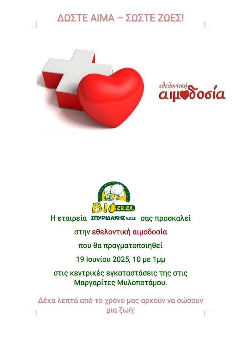 Μυλοπόταμος News > Ροή Ειδήσεων > Μυλοπόταμος > Εθελοντική αιμοδοσία διοργανώνει η ΒΙΟ.ΖΩ.ΕΛ την Πέμπτη 19/06/2025