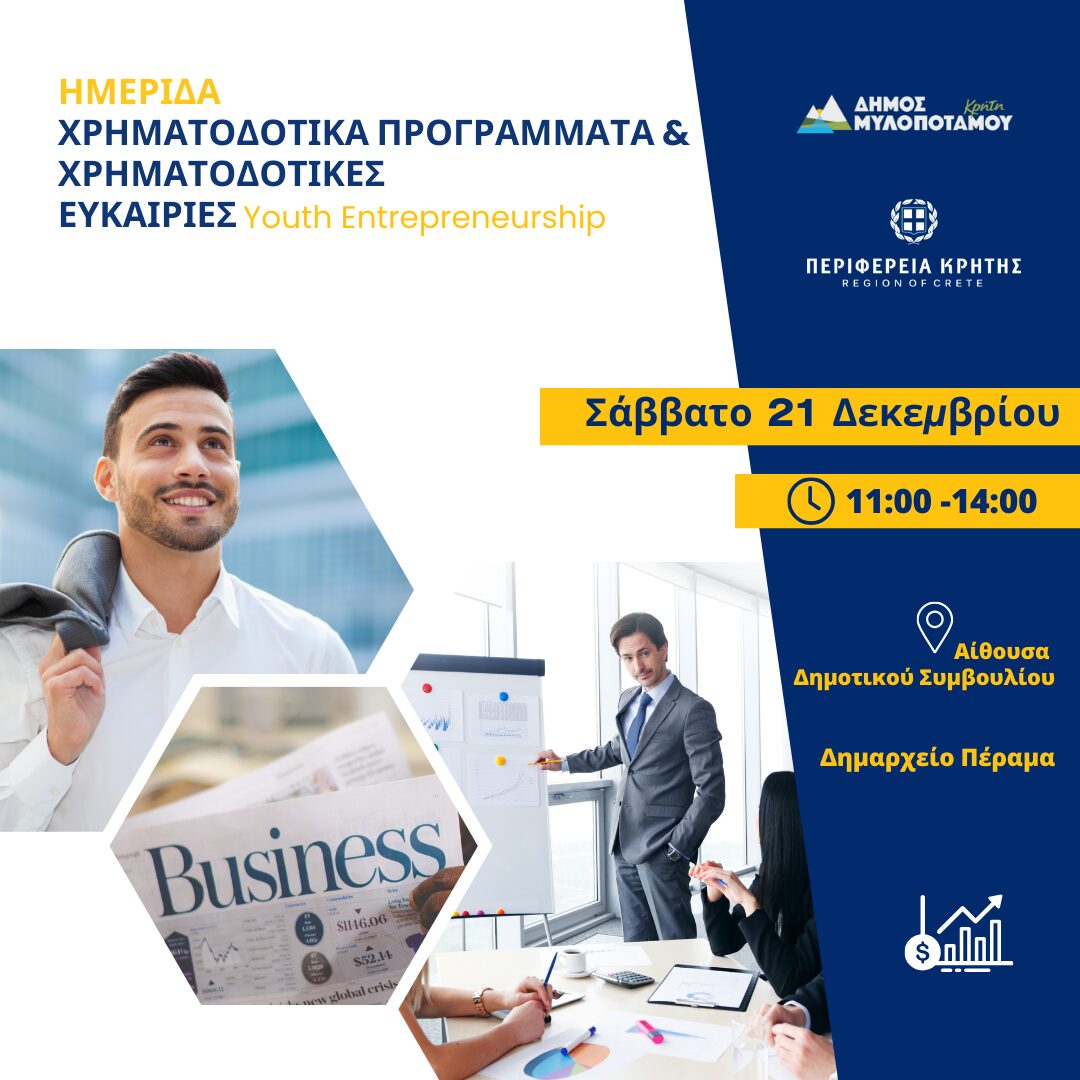 O Δήμος Μυλοποτάμου, σε συνεργασία με την Περιφέρεια Κρήτης, σας προσκαλεί να παρακολουθήσετε την Ημερίδα με θέμα «Χρηματοδοτικά Προγράμματα & Χρηματοδοτικές Ευκαιρίες», που θα πραγματοποιηθεί το Σάββατο 21 Δεκεμβρίου στην Αίθουσα Δημοτικού Συμβουλίου του Δημαρχείου Περάματος, από τις 11:00 έως τις 14:00.