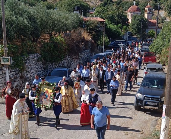 Η παρουσία τους, με τη λεβεντιά και την περηφάνια της Κρήτης να αποτυπώνεται σε κάθε βήμα, πρόσθεσε έναν βαθιά συγκινητικό τόνο στην πομπή. Ο κόσμος, ακολουθούσε σε ατμόσφαιρα γνήσιας κατάνυξης, ενώ ολόκληρο το χωριό έμοιαζε να υποκλίνεται στη χάρη του Αγίου, που οι κάτοικοι τιμούν χρόνια τώρα. Η πομπή κατέληξε στο Μνημείο Ηρώων απέναντι από την εκκλησία, εκεί όπου ο ουρανός και η γη ενώνονται με την πίστη και την ιστορική μνήμη.