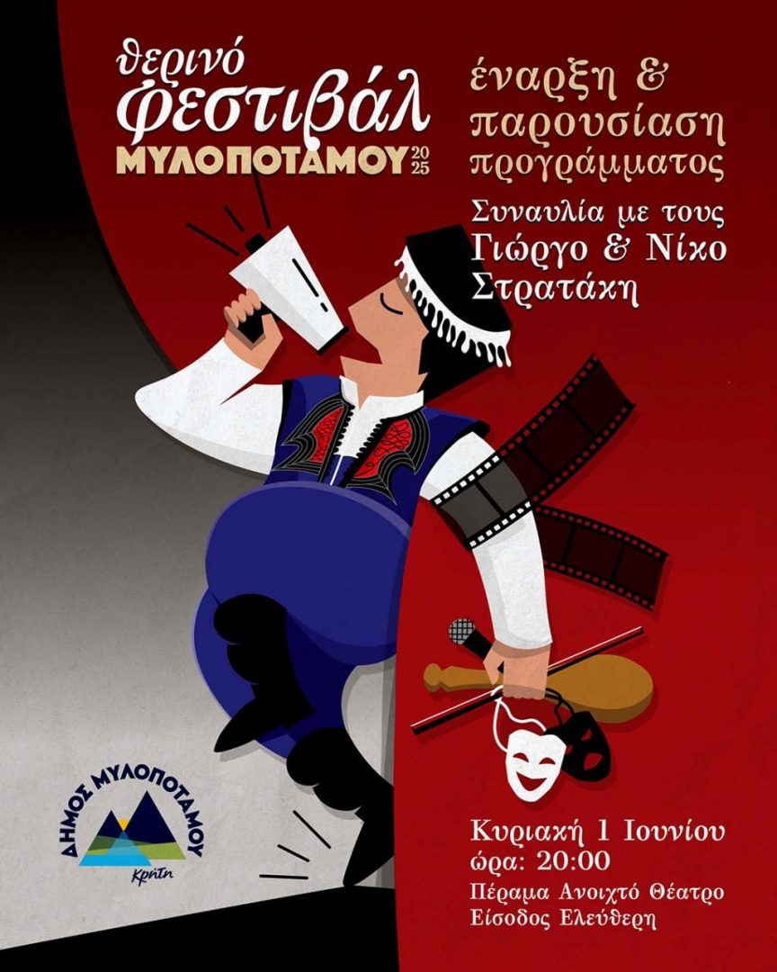 Ο Δήμος Μυλοποτάμου και η Επιτροπή Πολιτισμού του Δήμου, υπό την ευθύνη του αρμόδιου Αντιδημάρχου Πολιτισμού κ. Ζαχαρία Λαδιανού, έχουν την τιμή και τη χαρά να προσκαλέσουν όλους τους πολίτες και επισκέπτες στην επίσημη τελετή έναρξης του Θερινού Φεστιβάλ Πολιτισμού 2025, την: