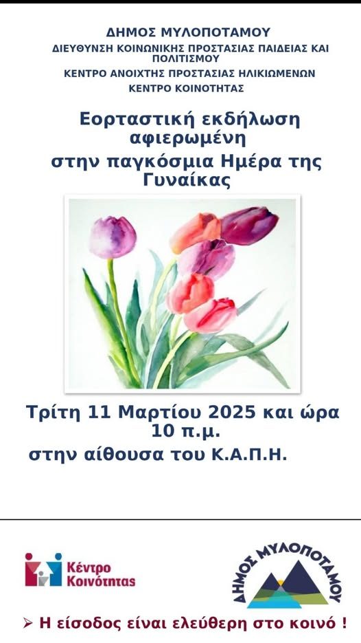 Ο Δήμος Μυλοποτάμου και ο Αντιδήμαρχος Κοινωνικής Προστασίας, Παιδείας & Πολιτισμού, κ. Ζαχαρίας Λαδιανός, σας προσκαλούν σε μια εκδήλωση αφιερωμένη στον ρόλο και τη δύναμη της Γυναίκας στην κοινωνία μας.