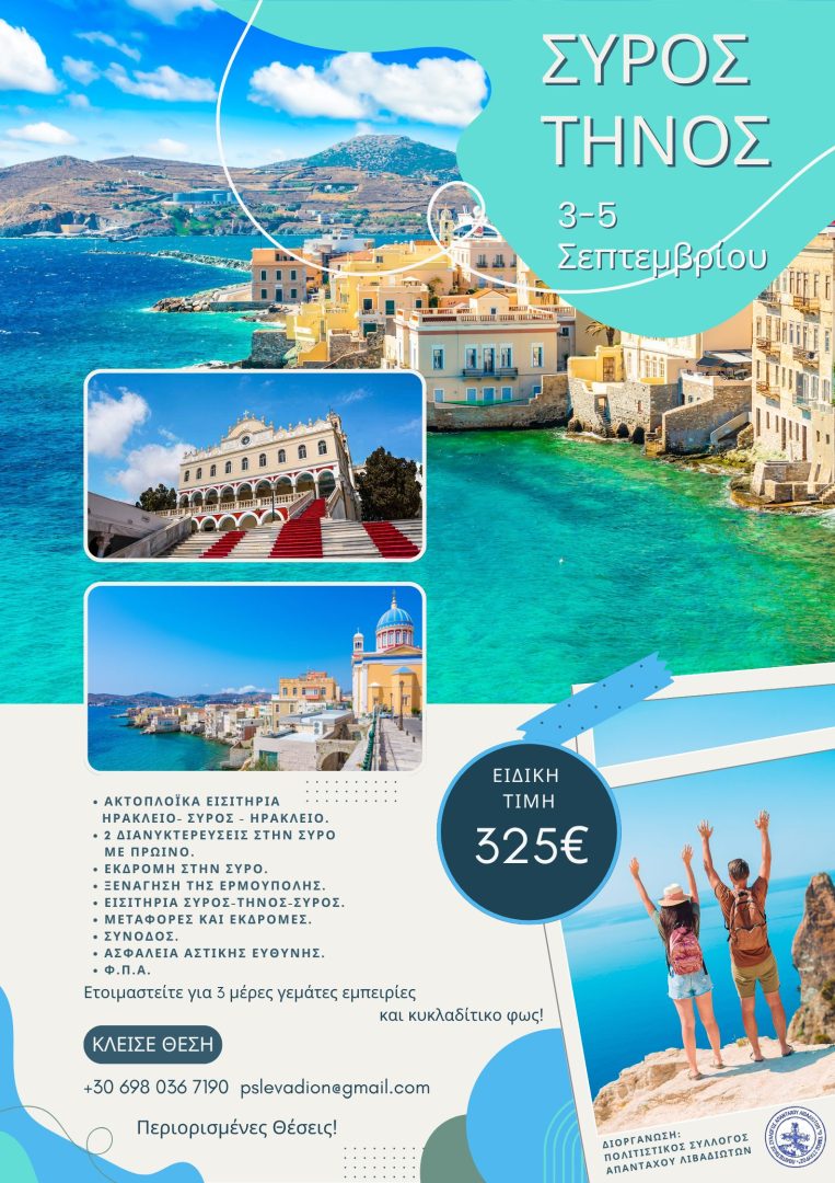 Μια ξεχωριστή πολιτιστική εκδρομή που ενώνει τον κυκλαδίτικο πολιτισμό, την ιστορία, την αρχιτεκτονική, την παράδοση και την πίστη, διοργανώνει ο Πολιτιστικός Σύλλογος Απανταχού Λιβαδιωτών. Με αναχώρηση απευθείας από το Ηράκλειο, οι συμμετέχοντες θα έχουν την ευκαιρία να γνωρίσουν την αριστοκρατική Σύρο, να προσκυνήσουν στην Παναγία της Τήνου και να απολαύσουν μια τριήμερη απόδραση υψηλού επιπέδου, με άνεση, ξεναγήσεις και άριστη φιλοξενία.
