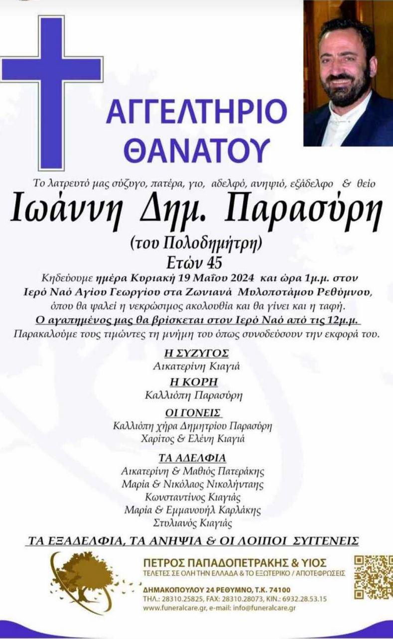 Έφυγε από τη ζωή στα 45 του χρόνια ο αγαπητός στην κοινωνία, Γιάννης Παρασύρης του Δημητρίου.