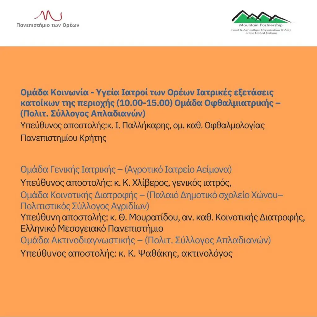 Την Παρασκευή 4 Οκτωβρίου 2024, το Πανεπιστήμιο των Ορέων – μέλος του Οργανισμού Ηνωμένων Εθνών – Mountain Partnership (FAO) – θα επισκεφτεί τα χωριά Απλαδιανά, Χώνος, Αγρίδια και Αείμονας του Δήμου Μυλοποτάμου, για να φέρει εκπαιδευτικές, ιατρικές και πολιτιστικές δράσεις κοντά στην τοπική κοινότητα.