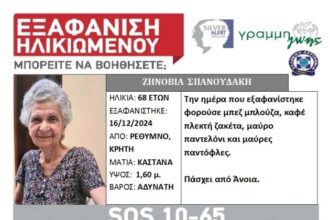 Ανησυχία επικρατεί στο Ρέθυμνο μετά την εξαφάνιση της 68χρονης Ζηνοβίας Σπανουδάκη, η οποία αγνοείται από το βράδυ της 16ης Δεκεμβρίου. Η…