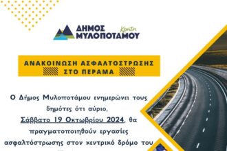 Ο Δήμος Μυλοποτάμου ενημερώνει τους δημότες ότι αύριο, Σάββατο 19 Οκτωβρίου 2024, θα πραγματοποιηθούν εργασίες ασφαλτόστρωσης στον κεντρικό δρόμο του…