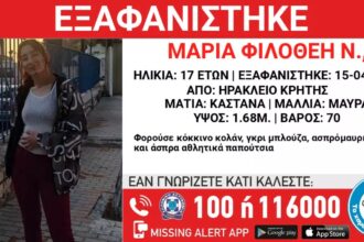 Εξαφανίστηκε από νοσοκομείο στο Ηράκλειο στις 15/04/24, στις 10:22 το βράδυ, η Μαρία – Φιλοθέη, Ν., 17 ετών. «Το Χαμόγελο του…