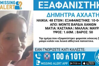 Όπως αναφέρει το «Χαμόγελο του Παιδιού», στις 10/04/2024 πρωινές ώρες, εξαφανίστηκε από την περιοχή Μόντε Βάρδια Χανίων η Αχλάτη Δήμητρα, 48…