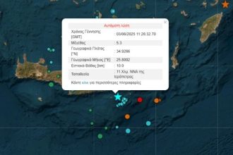 Ισχυρή σεισμική δόνηση έγινε αισθητή λίγα λεπτά πριν από τις 2 και 30 στην Κρήτη. Σύμφωνα με την αυτόματη λύση του Γεωδυναμικού Ινστιτούτου…