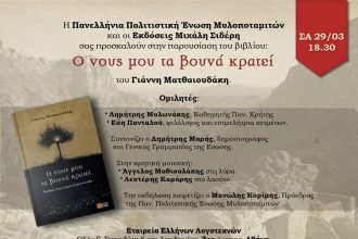 Tο Σαββατο 29 Μαρτίου, η Πανελλήνια Πολιτιστική Ένωση Μυλοποταμιτών παρουσιάζει το βιβλίο του Γιάννη Ματθαιουδάκη, με τίτλο “ο νους μου…