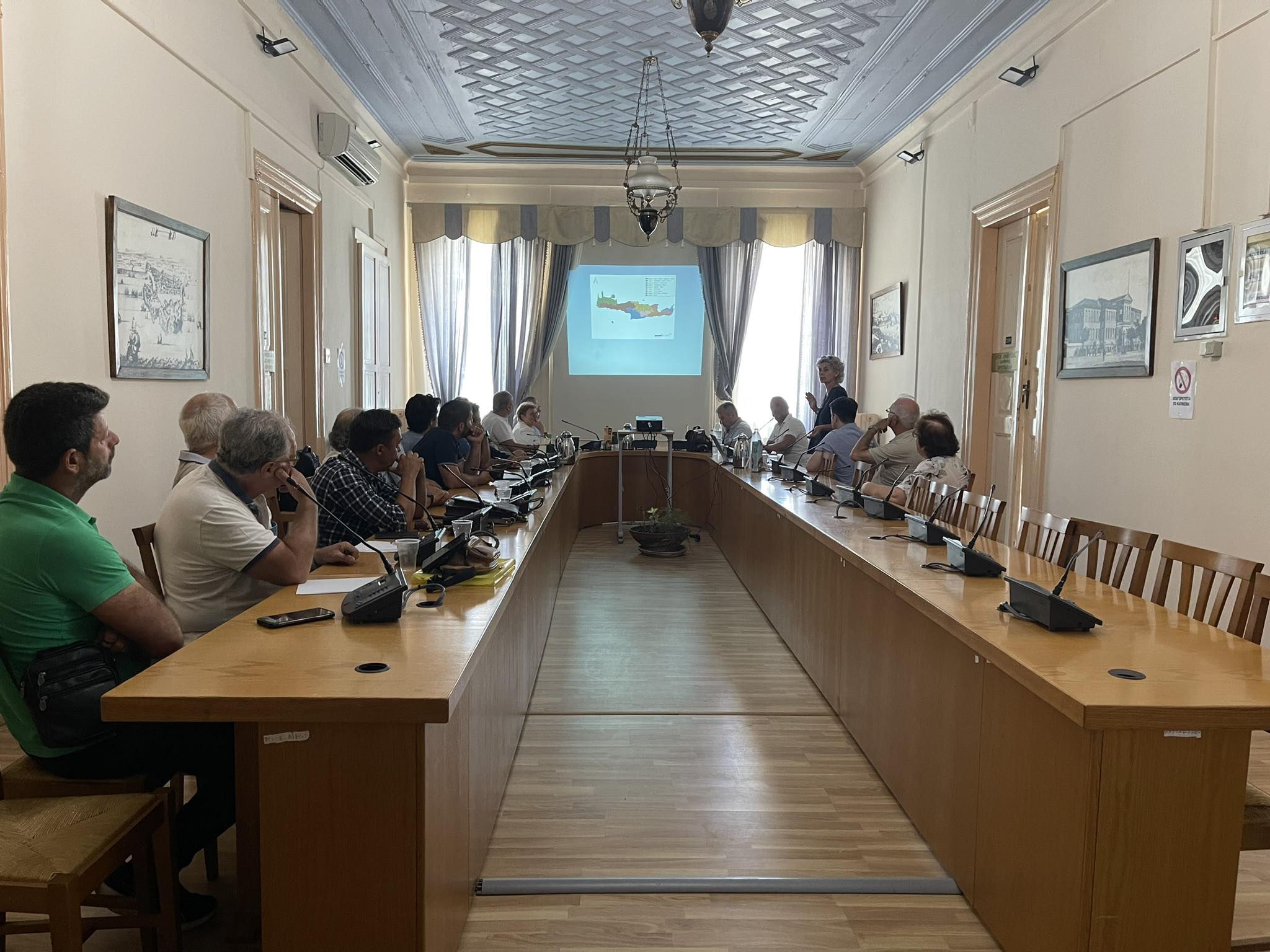 Στη σύσκεψη που συγκάλεσε σήμερα στο Ρέθυμνο η Διεύθυνση Υδάτων της Αποκεντρωμένης Διοίκησης Κρήτης σε συνεργασία με την Περιφέρεια Κρήτης και τον Ελληνικό Γεωργικό Οργανισμό (ΕΛΓΟ ΔΗΜΗΤΡΑ) συμμετείχε η Αντιπεριφερειάρχης Ρεθύμνης κα Μαίρη Λιονή, ο Θεματικός Αντιπεριφερειάρχης Επιχειρηματικότητας κ. Μιχάλης Βάμβουκας, ο Δήμαρχος Ρεθύμνης κ. Γιώργος Μαρινάκης, ο Αντιδήμαρχος Αμαρίου κ. Παύλος Κουρκουλός, ο Αντιδήμαρχος Μυλοποτάμου κ. Σήφης Βουκάλης,  ο πρόεδρος του ΟΑΚ κ. Θοδωρής Νίνος, οι περιφερειακοί σύμβουλοι κ. Σαρρής και κ. Μανουσάκης, ο δημοτικός σύμβουλους Ρεθύμνης κ. Μανουσογιάννης, εκπρόσωποι των ΤΟΕΒ Αγ. Γαλήνης, Βυζαρίου, Αγ. Βασιλείου και Επισκοπής καθώς και υπηρεσιακοί παράγοντες της Αποκεντρωμένης Διοίκησης, της Περιφέρειας Κρήτης και του ΟΑΚ