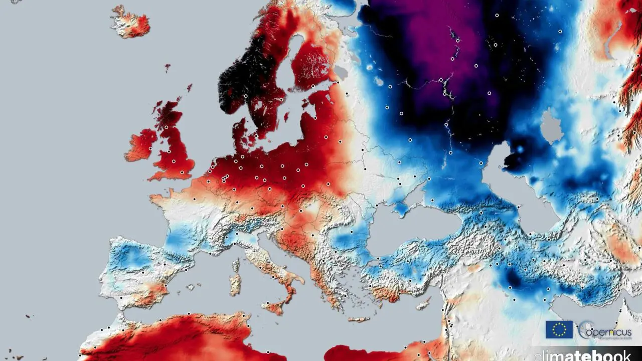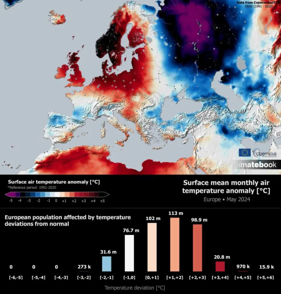 Στην Ευρώπη, οι θερμοκρασίες τον Μάιο 2024 ήταν κατά 0.88°C πάνω από τον μέσο όρο της περιόδου 1991-2020. Πολύ μεγάλες θετικές αποκλίσεις της θερμοκρασίας σε περιοχές της Κεντρικής, Βορειοδυτικής και Βόρειας Ευρώπης, όπου η μέση θερμοκρασία για τον Μάιο 2024 ήταν μέχρι και 3-5°C πάνω από την μέση τιμή της περιόδου 1991-2020. Μεγάλες αρνητικές αποκλίσεις σημειώθηκαν σε περιοχές της Βορειοδυτικής Ρωσίας. Σε κανονικά για την εποχή επίπεδα και λίγο κάτω από την μέση τιμή της περιόδου 1991-2020 η θερμοκρασία στα Βαλκάνια και στη Δυτική Μεσόγειο .
