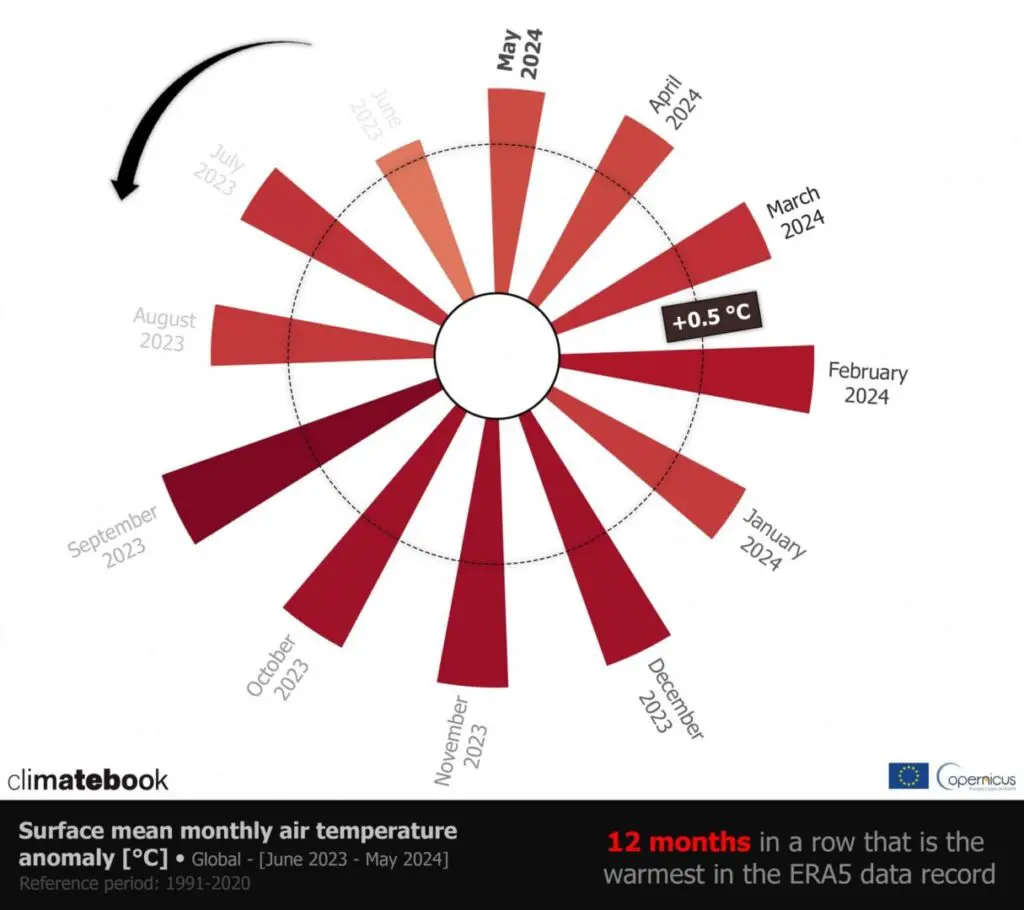 • Ο Μάιος του 2024 αποτελεί τον 12o συνεχόμενο μήνα (από τον Ιούνιο 2023) όπου σημειώνεται ρεκόρ θερμοκρασίας παγκοσμίως.